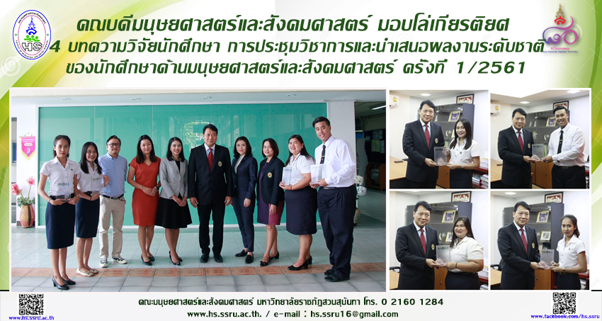 คณบดีมนุษยศาสตร์และสังคมศาสตร์ มอบโล่เกียรติยศ 4 บทความวิจัยนักศึกษา การประชุมวิชาการและนำเสนอผลงานระดับชาติของนักศึกษาด้านมนุษยศาสตร์และสังคมศาสตร์ ครั้งที่ 1/2561