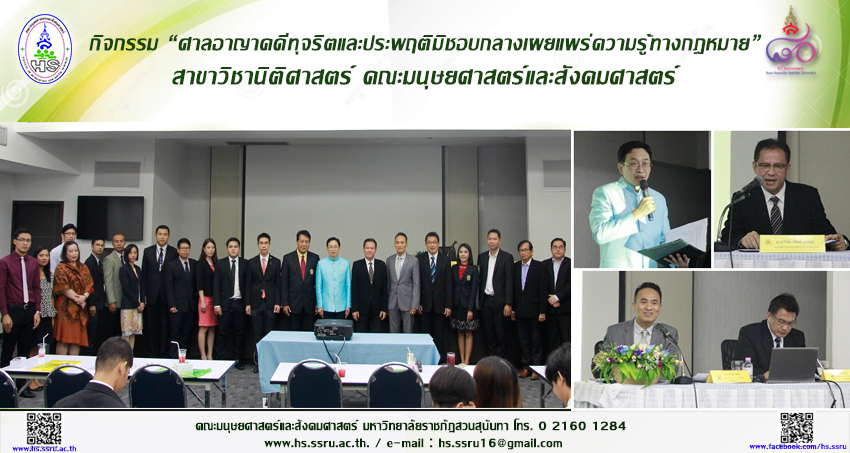 วันที่ 7 มิถุนายน 2561 สาขาวิชานิติศาสตร์ คณะมนุษยศาสตร์และสังคมศาสตร์ ร่วมกับสาขาวิชารัฐศาสตร์ วิทยาลัยนวัตกรรมและการจัดการ มหาวิทยาลัยราชภัฏสวนสุนันทา และศาลอาญาคดีทุจริตและประพฤติมิชอบกลาง จัดกิจกรรม “ศาลอาญาคดีทุจริตและประพฤติมิชอบกลางเผยแพร่ความรู้ทางกฎหมาย” เผยแพร่ความรู้ทางกฎหมายให้แก่คณาจารย์ บุคลากร และนักศึกษา มีรศ.ดร.ปรุงศักดิ์ อัตพุฒ รองอธิการบดีฝ่ายบริหาร เป็นประธานในการต้อนรับ พร้อมด้วยผศ.ดร.นิพนธ์ศศิธรสภา คณบดีคณะมนุษยศาสตร์และสังคมศาสตร์ คณาจารย์ และนักศึกษา ร่วมให้การต้อนรับคณะวิทยากรผู้ทรงคุณวุฒิจากศาลอาญาคดีทุจริตและประพฤติมิชอบกลาง และได้รับเกียรติจากนายวินัย เกิดด้วยทอง รองอธิบดีผู้พิพากษาศาลอาญาคดีทุจริตและประพฤติมิชอบกลาง เป็นประธานเปิดโครงการ