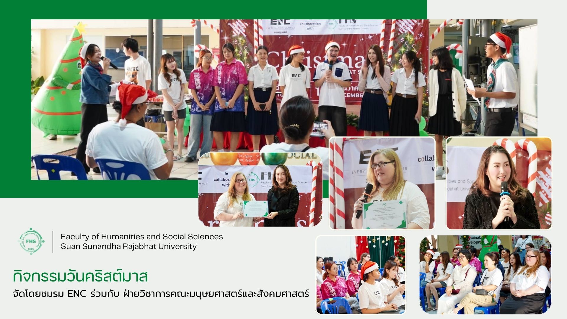 วันที่ 16 ธันวาคม 2568 เวลา 11.00 น. อาจารย์ ดร.นภาศรี สุวรรณโชติ คณบดีคณะมนุษยศาสตร์และสังคมศาสตร์ เป็นประธานในการเปิดกิจกรรมงานวันคริสต์มาส จัดโดยชมรม ENC ร่วมกับ ฝ่ายวิชาการคณะมนุษยศาสตร์และสังคมศาสตร์ โดยภายในงานประกอบด้วยกิจกรรมการแสดง กิจกรรมการเล่นเกมภาษาอังกฤษ และกิจกรรม Workshop ทั้งนี้ได้มอบใบประกาศนียบัตรอาจารย์ชาวต่างชาติที่ได้คะแนนประเมินการสอนสูงสุดจากนักศึกษา ให้แก่ อาจารย์ Jennilou Plankraiphet อาจารย์ประจำสาขาวิชาภาษาอังกฤษธุรกิจ ณ ลานกิจกรรม ชั้น 1 อาคาร 35