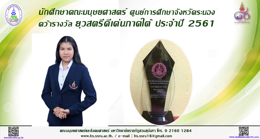 นักศึกษาคณะมนุษยศาสตร์ ศูนย์การศึกษาจังหวัดระนอง คว้ารางวัล ยุวสตรีดีเด่นภาคใต้ ประจำปี 2561