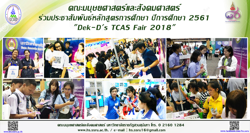 5 พฤษภาคม 2561 คณะมนุษยศาสตร์และสังคมศาสตร์ ร่วมกับฝ่ายประชาสัมพันธ์ กองกลางสำนักงานอธิการบดี มหาวิทยาลัยราชภัฏสวนสุนันทา ร่วมจัดกรรมแนะแนวการศึกษาต่อระดับอุดมศึกษา ประจำปีการศึกษา 2561 ในงาน "Dek-D's TCAS Fair 2018" ณ ศูนย์แสดงสินค้าไบเทค บางนา กรุงเทพมหานคร ในงานนี้มีนักเรียนและผู้ปกครองเข้าร่วมงานเป็นจำนวนมาก เพื่อศึกษาข้อมูลประกอบการตัดสินใจเลือกสาขาวิชาที่สนใจเข้าศึกษาในปีนี้