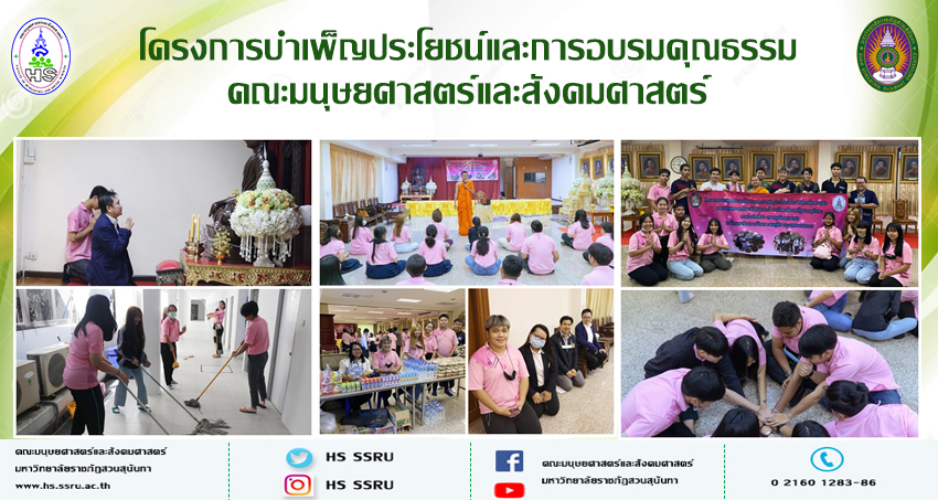 วันที่ 26 – 29 พฤศจิกายน 2563 ฝ่ายกิจการนักศึกษา คณะมนุษยศาสตร์และสังคมศาสตร์ จัดโครงการอบรมคุณธรรม จริยธรรม และบำเพ็ญประโยชน์ ประจำปีการศึกษา 2563 ให้แก่นักศึกษาของคณะฯ โดยมีอาจารย์ ดร.วีระ วีระโสภณ รองคณบดีฝ่ายกิจการนักศึกษา เป็นประธานในพิธีเปิดโครงการ ณ วัดราชาธิวาสวรวิหาร เขตดุสิต กทม. เพื่อเป็นการฝึกปฏิบัติด้านจิตอาสา การบำเพ็ญประโยชน์ และช่วยเหลือผู้อื่น เรียนรู้การใช้ชีวิตอยู่ร่วมกันกับผู้อื่น ร่วมสร้างความสัมพันธ์ระหว่างบุคคลและมีความรับผิดชอบต่อสังคม ส่งเสริมให้นักศึกษาได้มีการใช้เวลาว่างอย่างมีประโยชน์ ตลอดจนยึดถือคุณธรรม และจริยธรรมในการดำเนินชีวิตในสังคมได้อย่างมีความสุข
