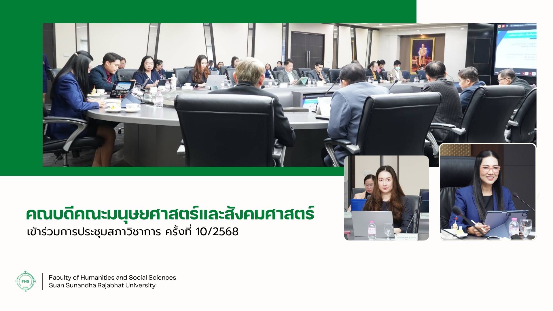 วันที่ 15 ตุลาคม 2568 เวลา 09.00 น. อาจารย์ ดร.นภาศรี สุวรรณโชติ คณบดีคณะมนุษยศาสตร์และสังคมศาสตร์ เข้าร่วมการประชุมสภาวิชาการ ครั้งที่ 10/2568 โดยมี รองศาสตราจารย์ ดร.ชุติกาญจน์ ศรีวิบูลย์ อธิการบดี เป็นประธาน ณ ห้องประชุมสภามหาวิทยาลัย อาคาร 31 ชั้น 5 มหาวิทยาลัยราชภัฏสวนสุนันทา