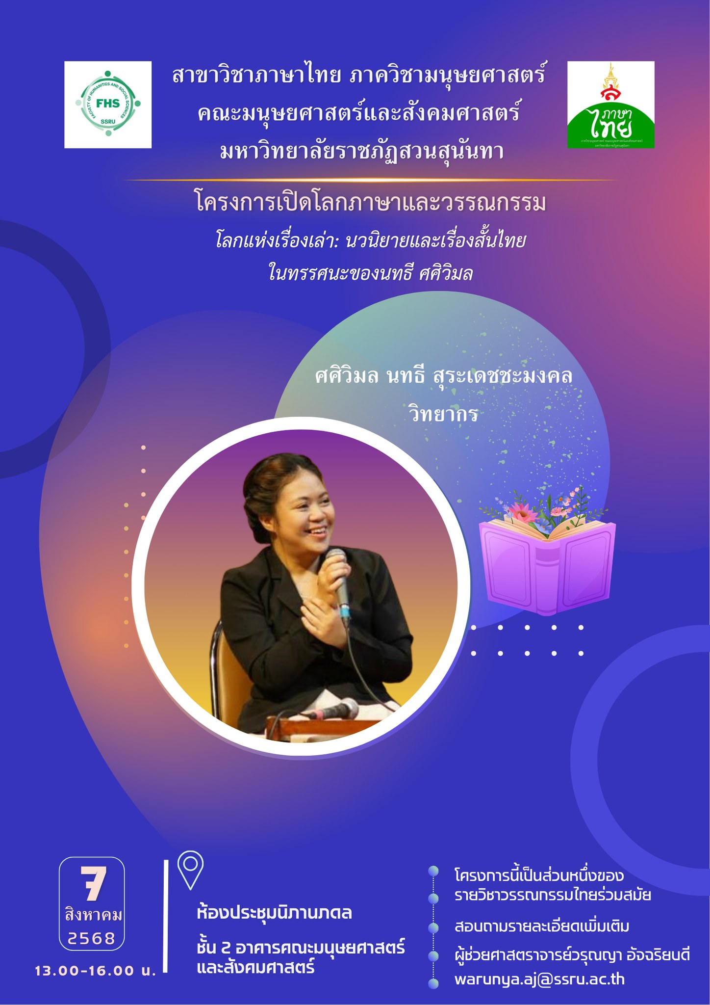 แจ้งความประสงค์เข้าร่วมฟังการบรรยาย หรือสอบถามรายละเอียดเพิ่มเติมได้ที่ E-mail: warunya.aj@ssru.ac.th (ผศ.วรุณญา อัจฉริยบดี) หรือกล่องข้อความเพจเฟซบุ๊ก สาขาวิชาภาษาไทย ภาควิชามนุษยศาสตร์ คณะมนุษยศาสตร์และสังคมศาสตร์ มหาวิทยาลัยราชภัฏสวนสุนันทา