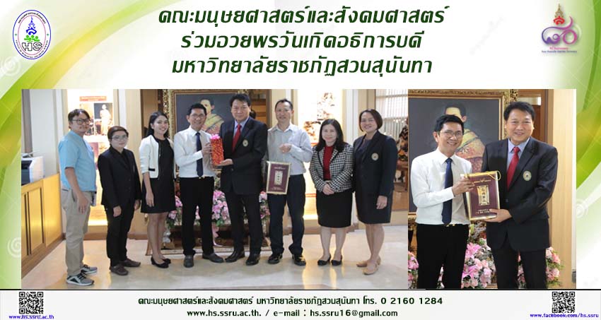 22 กุมภาพันธ์ 2562 ผศ.ดร.นิพนธ์ ศศิธรเสาวภา คณบดีคณะมนุษยศาสตร์และสังคมศาสตร์ นำคณะผู้บริหาร คณาจารย์ และบุคลากรคณะมนุษยศาสตร์และสังคมศาสตร์ เข้าอวยพรวันเกิด รศ.ดร.ฤๅเดช เกิดวิชัย อธิการบดีมหาวิทยาลัยราชภัฏสวนสุนันทา ณ อาคารสำนักงานอธิการบดี มหาวิทยาลัยราชภัฏสวนสุนันทา