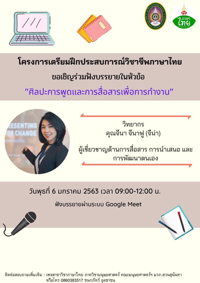 วันพุธที่ 6 มกราคม 2563 สาขาวิชาภาษาไทย ขอเชิญรับฟังการบรรยายในหัวข้อ "ศิลปะการพูดและการสื่อสารเพื่อการทำงาน" ในรายวิชาเตรียมฝึกประสบการณ์วิชาชีพภาษาไทย โดยวิทยากร คุณจีนา จีนาฟู (จีน่า) ผู้เชี่ยวชาญด้านการสื่อสาร การนำเสนอ และการพัฒนาตนเอง ฟังบรรยายผ่านระบบ Google meet ตั้งแต่เวลา 09.00-12.00 น. เป็นต้นไป