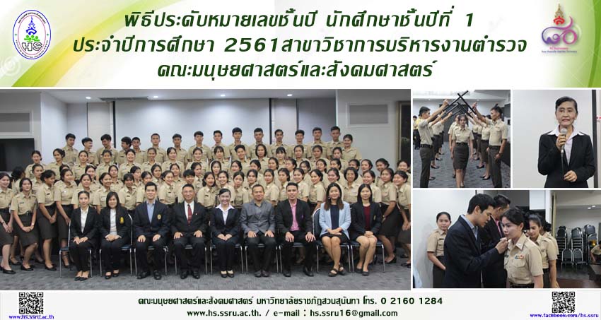9 กุมภาพันธ์ 2562 สาขาวิชาการบริหารงานตำรวจ คณะมนุษยศาสตร์และสังคมศาสตร์ จัดกิจกรรมประดับหมายเลขชั้นปี นักศึกษาชั้นปีที่ 1 ประจำปีการศึกษา 2561 เพื่อเป็นการแสดงความยินดีแก่นักศึกษาชั้นปีที่ 1 ที่ได้รับการฝึกปฏิบัติการตามที่หลักสูตรกำหนดเป็นการพัฒนาบุคลิกภาพ ความอดทนและมีคุณธรรมจริยธรรมที่ดีของนักศึกษา ทั้งนี้ได้รับเกียรติจากศาสตราจารย์ พล.ต.ท. หญิง ดร.นัยนา เกิดวิชัย ประธานในพิธีพร้อมกล่าวแสดงความยินดีและให้โอวาทแก่นักศึกษา ให้เป็นนักศึกษาที่ดี มีคุณภาพ และเป็นบัณฑิตที่ดีต่อสังคม โดยมีอาจารย์คณะตำรวจศาสตร์ โรงเรียนนายร้อยตำรวจ และอาจารย์ประจำสาขาวิชาการบริหารงานตำรวจ ร่วมพิธี ณ ห้องประชุมช่อแก้ว อาคาร 31 มหาวิทยาลัยราชภัฏสวนสุนันทา