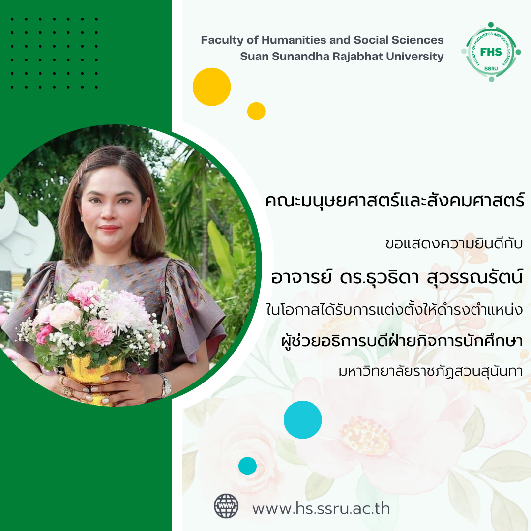 คณะมนุษยศาสตร์และสังคมศาสตร์ ขอแสดงความยินดีกับ อาจารย์ ดร.ธุวธิดา สุวรรณรัตน์ ในโอกาสได้รับการแต่งตั้งให้ดำรงตำแหน่งผู้ช่วยอธิการบดีฝ่ายกิจการนักศึกษา มหาวิทยาลัยราชภัฏสวนสุนันทา