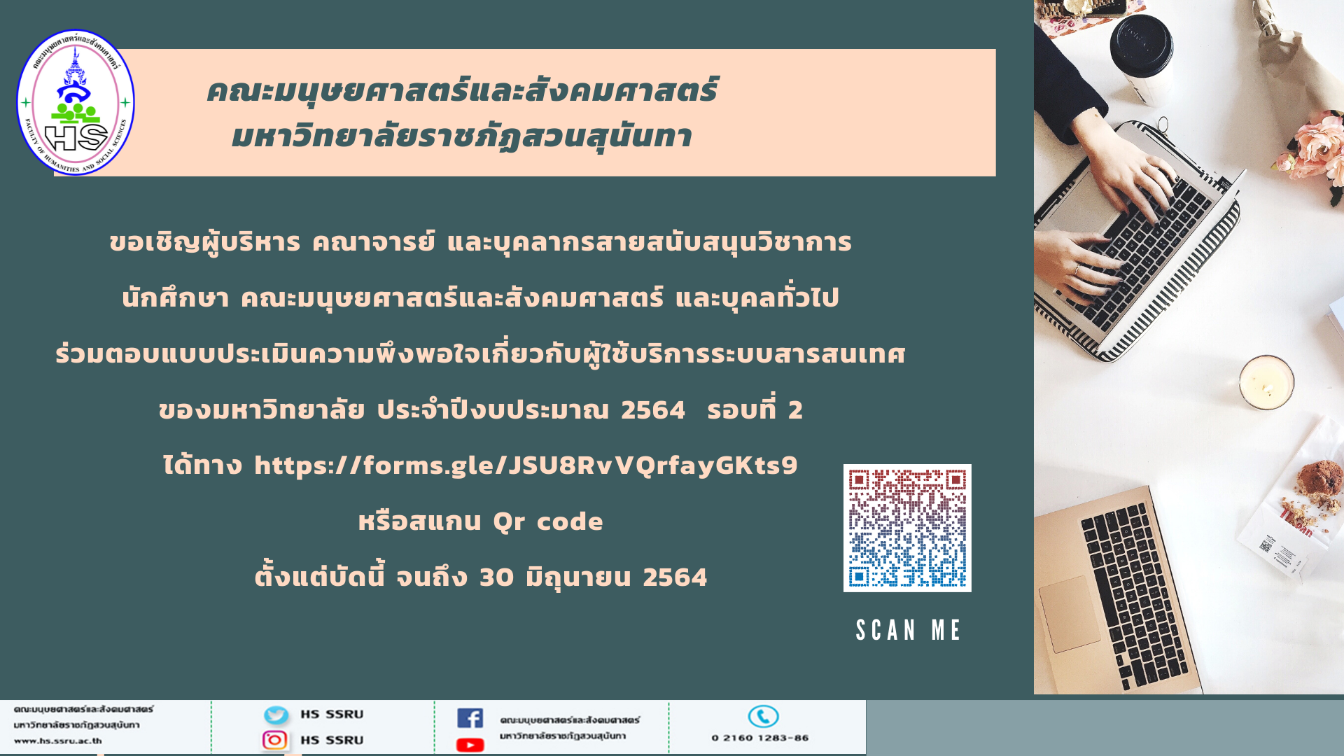 ขอเชิญผู้บริหาร คณาจารย์ และบุคลากรสายสนับสนุนวิชาการ นักศึกษา คณะมนุษยศาสตร์และสังคมศาสตร์ และบุคลทั่วไป ร่วมตอบแบบประเมินความพึงพอใจเกี่ยวกับผู้ใช้บริการระบบสารสนเทศของมหาวิทยาลัย ประจำปีงบประมาณ 2564 รอบที่ 2