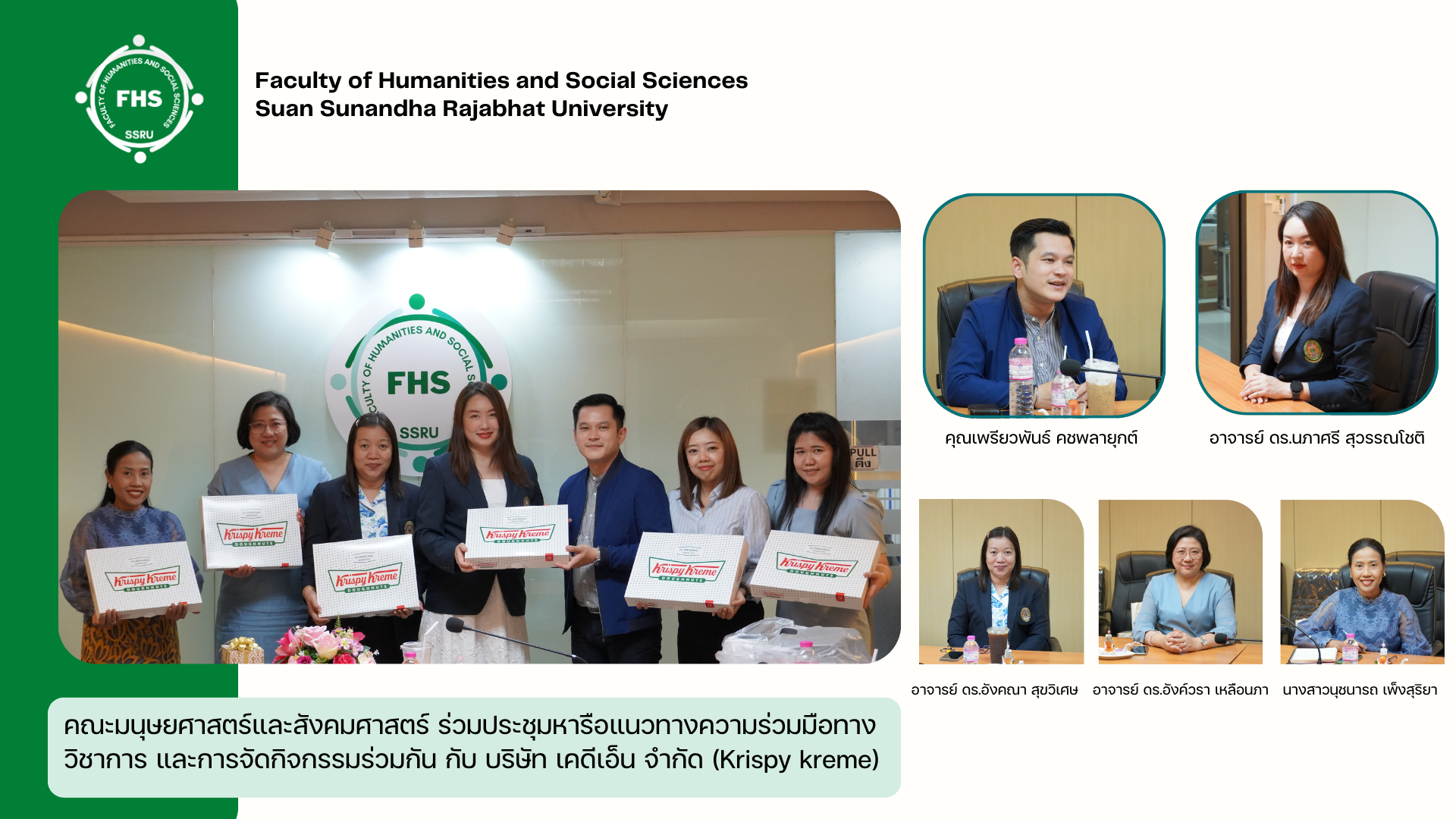 วันที่ 20 มกราคม 2568 เวลา 13.00 น. อาจารย์ ดร.นภาศรี สุวรรณโชติ คณบดีคณะมนุษยศาสตร์และสังคมศาสตร์ พร้อมด้วย อาจารย์ ดร.อังคณา สุขวิเศษ รองคณบดีฝ่ายวิชาการ อาจารย์ ดร.อังค์วรา เหลือนภา รองคณบดีฝ่ายพัฒนาธุรกิจและจัดหารายได้ และ นางสาวนุชนารถ เพ็งสุริยา รักษาการหัวหน้าสำนักงาน ร่วมประชุมหารือแนวทางความร่วมมือทางวิชาการ และการจัดกิจกรรมร่วมกัน กับ บริษัท เคดีเอ็น จำกัด (Krispy kreme) นำโดย คุณเพรียวพันธ์ คชพลายุกต์ HR Manager และทีมงานเข้าร่วมการหารือ ณ ห้องประชุมพรโสภิณ อาคาร 35 ชั้น 1 คณะมนุษยศาสตร์และสังคมศาสตร์ มหาวิทยาลัยราชภัฏสวนสุนันทา