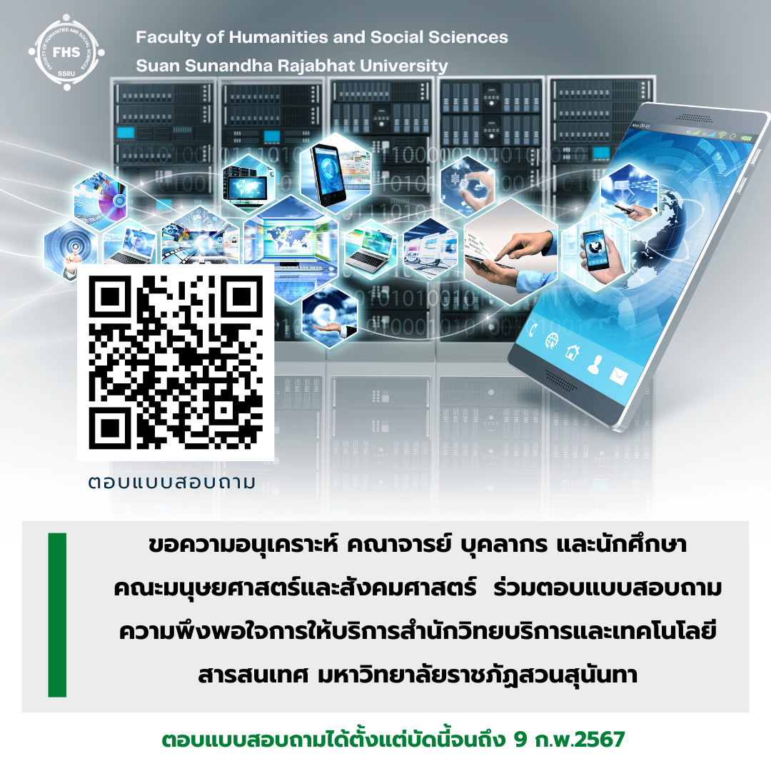 ขอความอนุเคราะห์ คณาจารย์ บุคลากร และนักศึกษาคณะมนุษยศาสตร์และสังคมศาสตร์ มหาวิทยาลัยราชภัฏสวนสุนันทา ร่วมตอบแบบสอบถามความพึงพอใจการให้บริการสำนักวิทยบริการและเทคโนโลยีสารสนเทศ มหาวิทยาลัยราชภัฏสวนสุนันทา