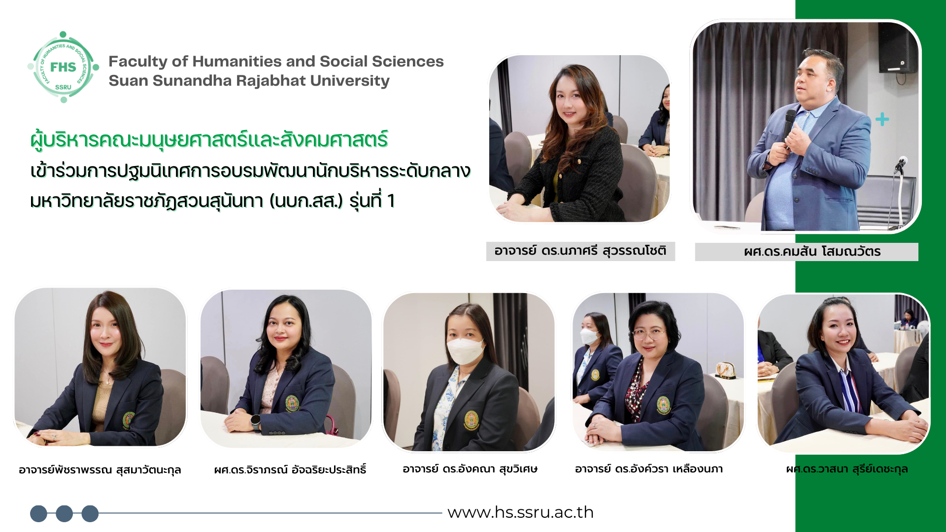 วันที่ 21 มิถุนายน 2567 อาจารย์ ดร.นภาศรี สุวรรณโชติ คณบดีคณะมนุษยศาสตร์และสังคมศาสตร์ เข้าร่วมการปฐมนิเทศการอบรมพัฒนานักบริหารระดับกลาง มหาวิทยาลัยราชภัฏสวนสุนันทา (นบก.สส.) รุ่นที่ 1 จัดโดยกองบริหารงานบุคคล โดยมี ผศ.ดร.คมสัน โสมณวัตร รองอธิการบดีฝ่ายบริหาร เป็นประธาน พร้อมด้วยคณะผู้บริหารคณะมนุษยศาสตร์และสังคมศาสตร์ อาจารย์พัชราพรรณ สุสมาวัตนะกุล (รองคณบดีฝ่ายบริหาร) อาจารย์ ดร.อังคณา สุขวิเศษ (รองคณบดีฝ่ายวิชาการ) อาจารย์ ดร.อังค์วรา เหลืองนภา (รองคณบดีฝ่ายวิจัยและบริการวิชาการ) ผศ.ดร.วาสนา สุรีย์เดชะกุล (รองคณบดีฝ่ายแผนงานและประกันคุณภาพ) และ ผศ.ดร.จิราภรณ์ อัจฉริยะประสิทธิ์ (รองคณบดีฝ่ายกิจการนักศึกษาและศิลปวัฒนธรรม) ณ ห้อง 5724 ชั้น 2 คณะวิทยาการจัดการ