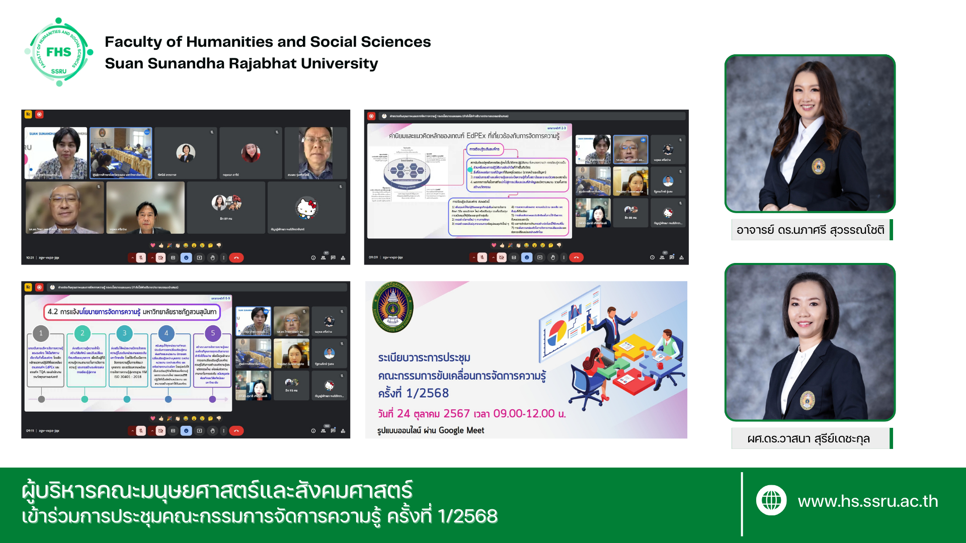 วันที่ 24 ตุลาคม 2567 เวลา 9.00 – 12.00 น. อาจารย์ ดร.นภาศรี สุวรรณโชติ คณบดีคณะมนุษยศาสตร์และสังคมศาสตร์ พร้อมด้วย ผู้ช่วยศาสตราจารย์ ดร.วาสนา สุรีย์เดชะกุล รองคณบดีฝ่ายแผนงานและประกันคุณภาพ และบุคลากรที่เกี่ยวข้องเข้าร่วมการประชุมคณะกรรมการจัดการความรู้ ครั้งที่ 1/2568 ซึ่งจัดโดยกองนโยบายและแผน โดยมี รองศาสตราจารย์ ดร.วิทยา เมฆขำ รองอธิการฝ่ายแผนงานและประกันคุณภาพ เป็นประธานการประชุมผ่าน Google Meet