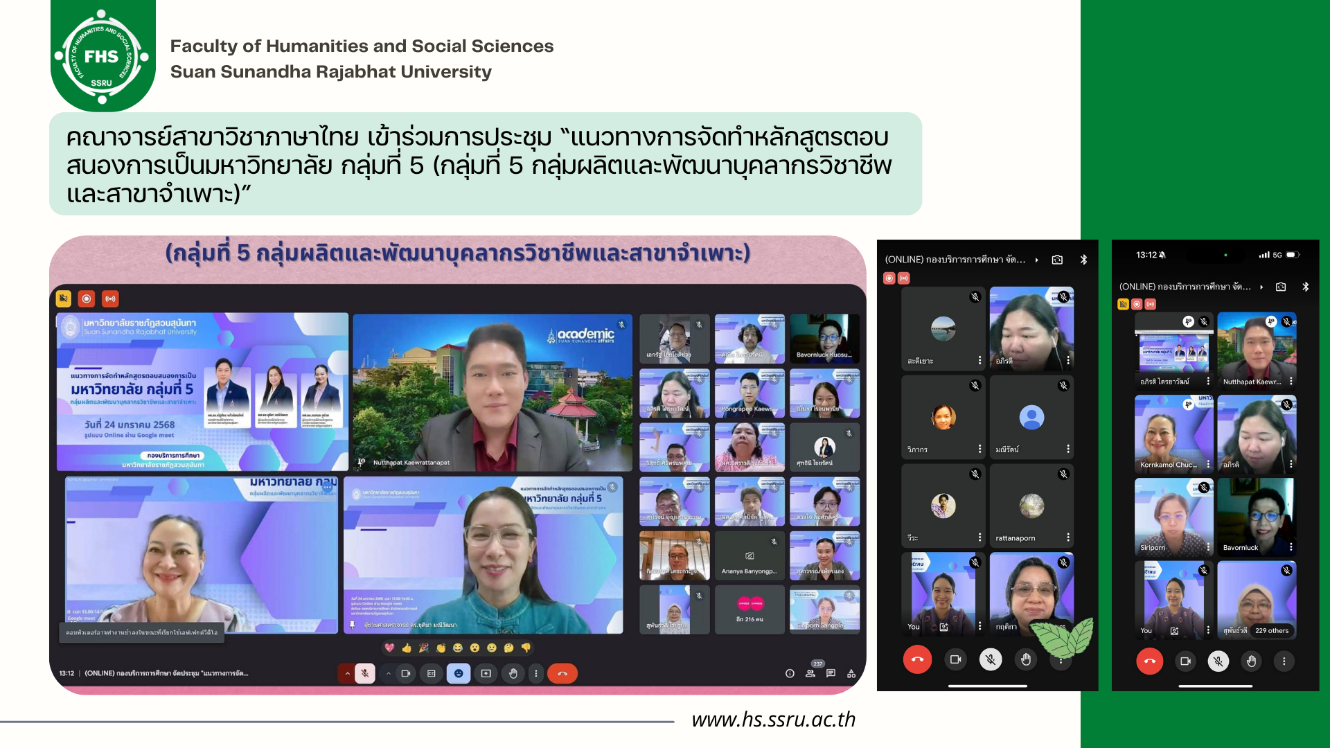 เมื่อวันที่ 24 มกราคม 2568 เวลา 13.00 น. คณาจารย์ประจำสาขาวิชาภาษาไทย คณะมนุษยศาสตร์และสังคมศาสตร์ มหาวิทยาลัยราชภัฏสวนสุนันทา เข้าร่วมการประชุม “แนวทางการจัดทำหลักสูตรตอบสนองการเป็นมหาวิทยาลัย กลุ่มที่ 5 (กลุ่มที่ 5 กลุ่มผลิตและพัฒนาบุคลากรวิชาชีพและสาขาจำเพาะ)” ผ่านระบบออนไลน์ Google Meet โดยมี ผู้ช่วยศาสตราจารย์ ดร.ณัฐภัทร แก้วรัตนภัทร์ รองอธิการบดีฝ่ายวิชาการ เป็นประธานการประชุม พร้อมด้วย ผู้ช่วยศาสตราจารย์ ดร. ชุติมา มณีวัฒนา ผู้ช่วยอธิการบดีฝ่ายวิชาการ และ ผู้ช่วยศาสตรจารย์ ดร. กรกมล ชูช่วย ผู้ช่วยอธิการบดีฝ่ายหลักสูตรและการจัดการเรียนการสอน ร่วมกันขับเคลื่อนแนวทางการจัดทำหลักสูตรตอบสนองการเป็นมหาวิทยาลัย กลุ่มที่ 5 (กลุ่มที่ 5 กลุ่มผลิตและพัฒนาบุคลากรวิชาชีพและสาขาจำเพาะ) เพื่อยกระดับคุณภาพการศึกษาของมหาวิทยาลัยราชภัฏสวนสุนันทา