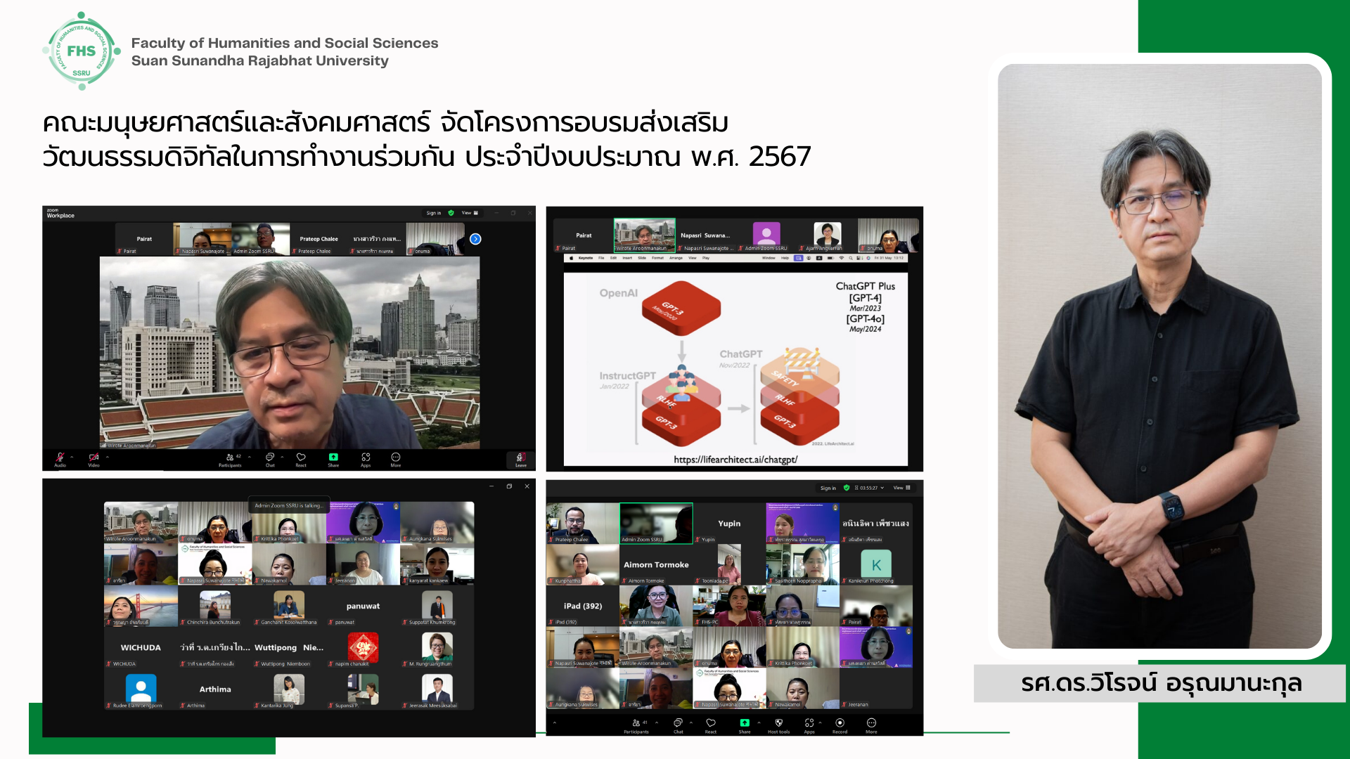 วันที่ 31 พฤษภาคม 2567 คณะมนุษยศาสตร์และสังคมศาสตร์ มหาวิทยาลัยราชภัฏสวนสุนันทา โดยฝ่ายบริหารงานทั่วไป ได้จัดโครงการอบรมกิจกรรมส่งเสริมวัฒนธรรมดิจิทัลในการทำงานร่วมกัน ประจำปีงบประมาณ พ.ศ. 2567 โดยจัดการอบรมในหัวข้อ “การใช้งานปัญญาประดิษฐ์สำหรับวิชาการและสนับสนุนวิชาการ” โดยการอบรมในครั้งนี้ได้รับเกียรติจาก รองศาสตราจารย์ ดร.วิโรจน์ อรุณมานะกุล ผู้อำนวยการสถาบันภาษาไทยสิรินธร จุฬาลงกรณ์มหาวิทยาลัย มาเป็นวิทยากรผ่านโปรแกรม Zoom Meetings เพื่อให้ผู้เข้าร่วมอบรมสามารถนำความรู้ที่ได้รับไปประยุกต์ใช้ในการพัฒนางานวิชาการและสนับสนุนการเรียนการสอนต่อไป