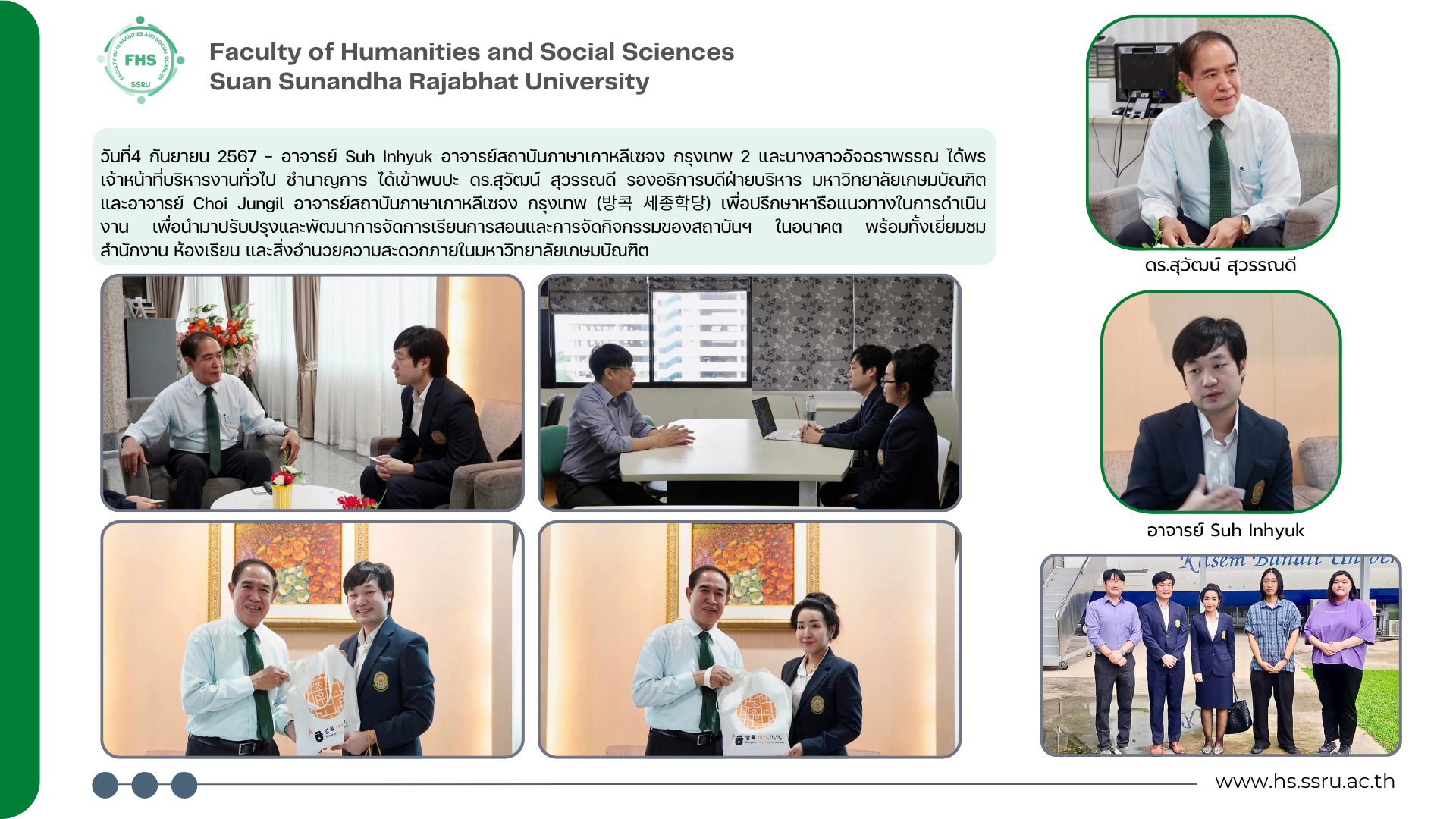 วันที่ 4 กันยายน 2567 อาจารย์ Suh Inhyuk อาจารย์สถาบันภาษาเกาหลีเซจง กรุงเทพ 2 และนางสาวอัจฉราพรรณ ได้พร เจ้าหน้าที่บริหารงานทั่วไป ชำนาญการ ได้เข้าพบปะ ดร.สุวัฒน์ สุวรรณดี รองอธิการบดีฝ่ายบริหาร มหาวิทยาลัยเกษมบัณฑิต และอาจารย์ Choi Jungil อาจารย์สถาบันภาษาเกาหลีเซจง กรุงเทพ (방콕 세종학당) เพื่อปรึกษาหารือแนวทางในการดำเนินงาน เพื่อนำมาปรับปรุงและพัฒนาการจัดการเรียนการสอนและการจัดกิจกรรมของสถาบันฯ ในอนาคต พร้อมทั้งเยี่ยมชมสำนักงาน ห้องเรียน และสิ่งอำนวยความสะดวกภายในมหาวิทยาลัยเกษมบัณฑิต