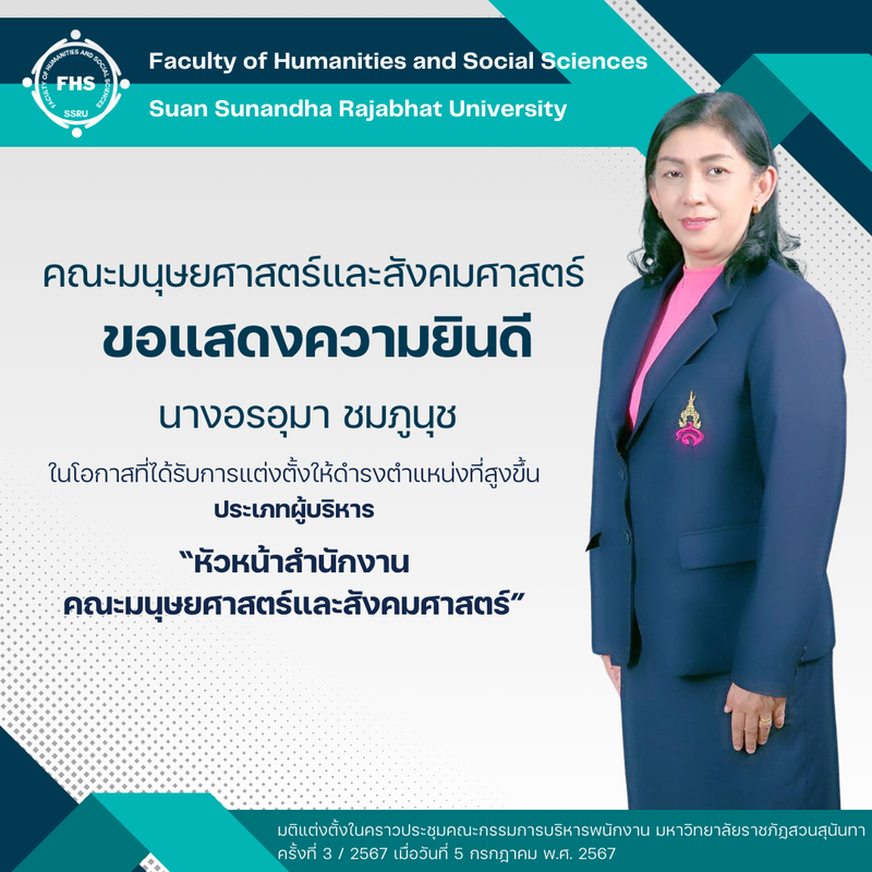 คณะมนุษยศาสตร์และสังคมศาสตร์ ขอแสดงความยินดี กับ นางอรอุมา ชมภูนุช ในโอกาสที่ได้รับการแต่งตั้งให้ดำรงตำแหน่งที่สูงขึ้น ประเภทผู้บริหาร “หัวหน้าสำนักงาน คณะมนุษยศาสตร์และสังคมศาสตร์” มีมติแต่งตั้งในคราวประชุมคณะกรรมการบริหารพนักงาน มหาวิทยาลัยราชภัฏสวนสุนันทา ครั้งที่ 3 / 2567 เมื่อวันที่ 5 กรกฎาคม พ.ศ. 2567