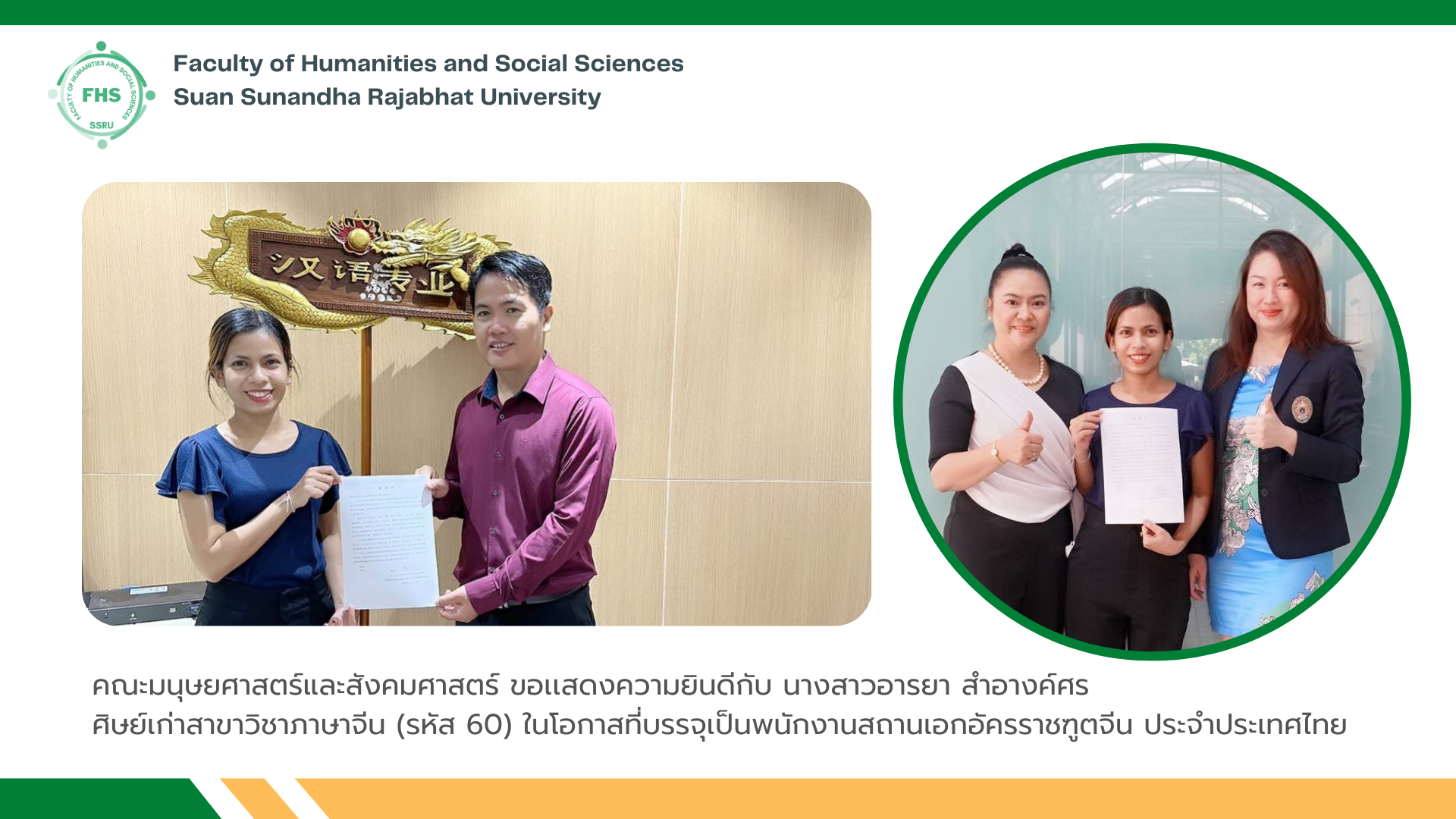 อาจารย์นภาศรี สุวรรณโชติ คณบดีคณะมนุษยศาสตร์และสังคมศาสตร์ พร้อมด้วย ผศ.ว่าที่ร้อยตรี ดร.เกรียงไกร กองเส็ง หัวหน้าสาขาวิชาภาษาจีน และอาจารย์ Luo Yun อาจารย์สาขาวิชาภาษาจีน ร่วมแสดงความยินดีกับ นางสาวอารยา สำอางศร ศิษย์เก่าสาขาวิชาภาษาจีน (รหัส 60) ในโอกาสที่บรรจุเป็นพนักงานสถานเอกอัครราชฑูตจีน ประจำประเทศไทย
