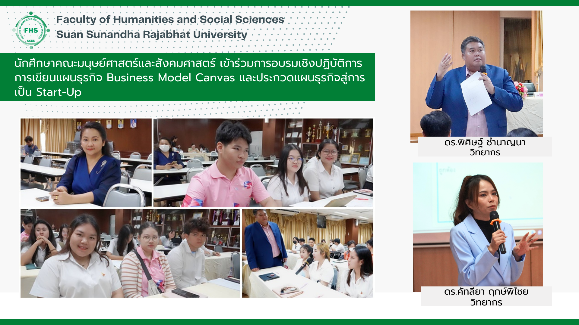 วันที่ 12 มกราคม 2567 นักศึกษาสาขาวิชาภาษาอังกฤษธุรกิจ และแขนงวิชาการจัดการทางวัฒนธรรม เข้าร่วมประกวดแผนธุรกิจสู่การเป็น Start-Up ภายใต้โครงการพัฒนานักศึกษาสู่การเป็นผู้ประกอบการรายใหม่ Start-up และได้รับเกียรติจากอาจารย์ ดร.พิศิษฐ์ ชำนาญนา และอาจารย์ ดร.คัทลียา ฤกษ์พิไชย มาเป็นคณะกรรมการตัดสิน โดยมีอาจารย์ ดร.ศิริมาลย์ วัฒนา อาจารย์ประจำแขนงวิชาการจัดการทางวัฒนธรรม ให้การดูนักศึกษาที่เข้าร่วมโครงการฯ ซึ่งจัดขึ้นโดยฝ่ายบริหารจัดการทรัพย์สินทางปัญญาและบ่มเพาะวิสาหกิจ สถาบันวิจัยและพัฒนามหาวิทยาลัยราชภัฏสวนสุนันทา ณ ห้องประชุมช่อแก้ว ชั้น 5 อาคาร 31 มหาวิทยาลัยราชภัฏสวนสุนันทา