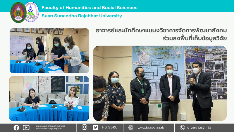 ผศ.ว่าที่ร้อยตรีหญิงเพ็ญนภา ปาละปิน หัวหน้าแขนงวิชาการจัดการพัฒนาสังคม คณะมนุษยศาสตร์และสังคมศาสตร์ พร้อมด้วย ผศ.ดร.ภูสิทธ์ ภูคำชะโนด นำนักศึกษาร่วมลงพื้นที่ เพื่อเรียนรู้การเก็บข้อมูลวิจัย และศึกษาวิถีการทำงานของฝ่ายพัฒนาชุมชนและสวัสดิการสังคม สำนักงานเขตดุสิต กรุงเทพมหานคร