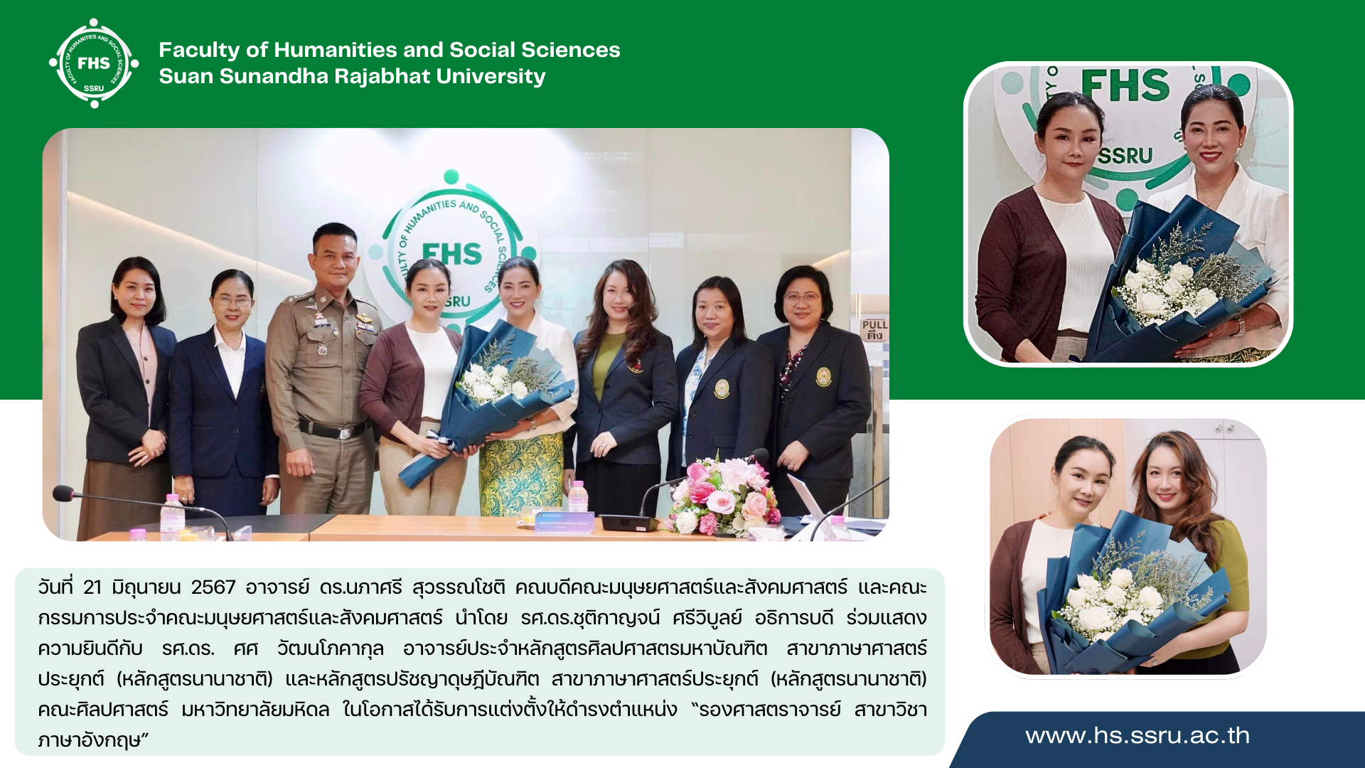 วันที่ 21 มิถุนายน 2567 อาจารย์ ดร.นภาศรี สุวรรณโชติ คณบดีคณะมนุษยศาสตร์และสังคมศาสตร์ คณะกรรมการประจำคณะมนุษยศาสตร์และสังคมศาสตร์ นำโดย รศ.ดร.ชุติกาญจน์ ศรีวิบูลย์ อธิการบดี ร่วมแสดงความยินดีกับ รศ.ดร. ศศ วัฒนโภคากุล อาจารย์ประจำหลักสูตรศิลปศาสตรมหาบัณฑิต สาขาภาษาศาสตร์ประยุกต์ (หลักสูตรนานาชาติ) และหลักสูตรปรัชญาดุษฎีบัณฑิต สาขาภาษาศาสตร์ประยุกต์ (หลักสูตรนานาชาติ) คณะศิลปศาสตร์ มหาวิทยาลัยมหิดล ในโอกาสได้รับการแต่งตั้งให้ดำรงตำแหน่ง “รองศาสตราจารย์ สาขาวิชาภาษาอังกฤษ”