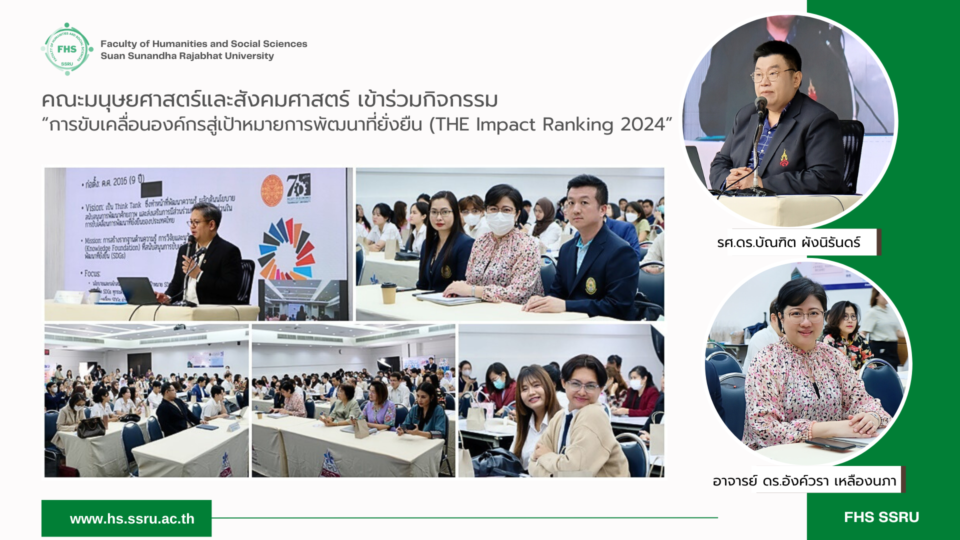 วันที่ 28 กุมภาพันธ์ 2567 อาจารย์ ดร.อังค์วรา เหลืองนภา รองคณบดีฝ่ายวิจัยและบริการวิชาการ คณะมนุษยศาสตร์และสังคมศาสตร์ พร้อมด้วย อาจารย์จีรศักดิ์ มีสุขสบาย อาจารย์ประจำสาขาวิชาภาษาอังกฤษธุรกิจ นางสาวอนินธิตา เพชรแสง บุคลากรฝ่ายพัฒนางานวิจัยและบริการวิชาการ และนักศึกษา เข้าร่วมกิจกรรม "การขับเคลื่อนองค์กรสู่เป้าหมายการพัฒนาที่ยั่งยืน (THE Impact Ranking 2024)" ซึ่งจัดขึ้นโดยฝ่ายบริการวิชาการ สถาบันวิจัยและพัฒนา มหาวิทยาลัยราชภัฏสวนสุนันทา โดยได้รับเกียรติจาก รศ.ดร.บัณฑิต ผังนิรันดร์ รองอธิการบดีฝ่ายวิจัยและพัฒนา เป็นประธานเปิดงาน และ ผศ.ชล บุญนาค ผู้อำนวยการศูนย์วิจัยและสนับสนุนเป้าหมายการพัฒนาที่ยั่งยืน (SDG Move) ให้เกียรติเป็นวิทยากรบรรยายในหัวข้อ “มหาวิทยาลัยกับการขับเคลื่อนเป้าหมายการพัฒนาที่ยั่งยืน (SDGS)” ณ ห้องประชุมช่อแก้ว อาคาร 31 ชั้น 5