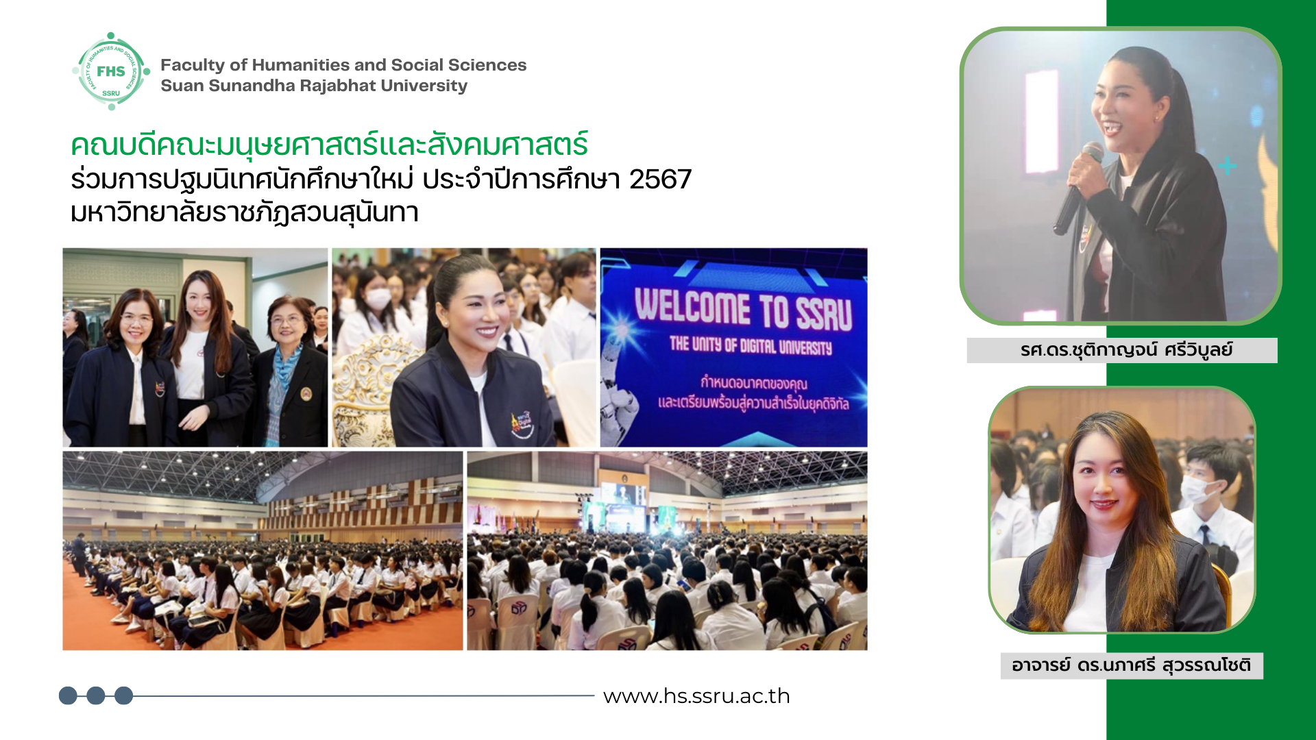 วันที่ 2 กรกฎาคม 2567 อาจารย์ ดร.นภาศรี สุวรรณโชติ คณบดีคณะมนุษยศาสตร์และสังคมศาสตร์ เข้าร่วมงานปฐมนิเทศนักศึกษาใหม่ ปีการศึกษา 2567 มหาวิทยาลัยราชภัฏสวนสุนันทา โดยมี รศ.ดร.ชุติกาญจน์ ศรีวิบูลย์ อธิการบดี กล่าวต้อนรับพร้อมบรรยายพิเศษ ในหัวข้อ “The Unity of Digital University” พร้อมด้วยคณะผู้บริหาร คณบดี ร่วมต้อนรับนักศึกษาใหม่ ณ อาคารศูนย์สุขภาพและกีฬา ชั้น 4 มหาวิทยาลัยราชภัฏสวนสุนันทา