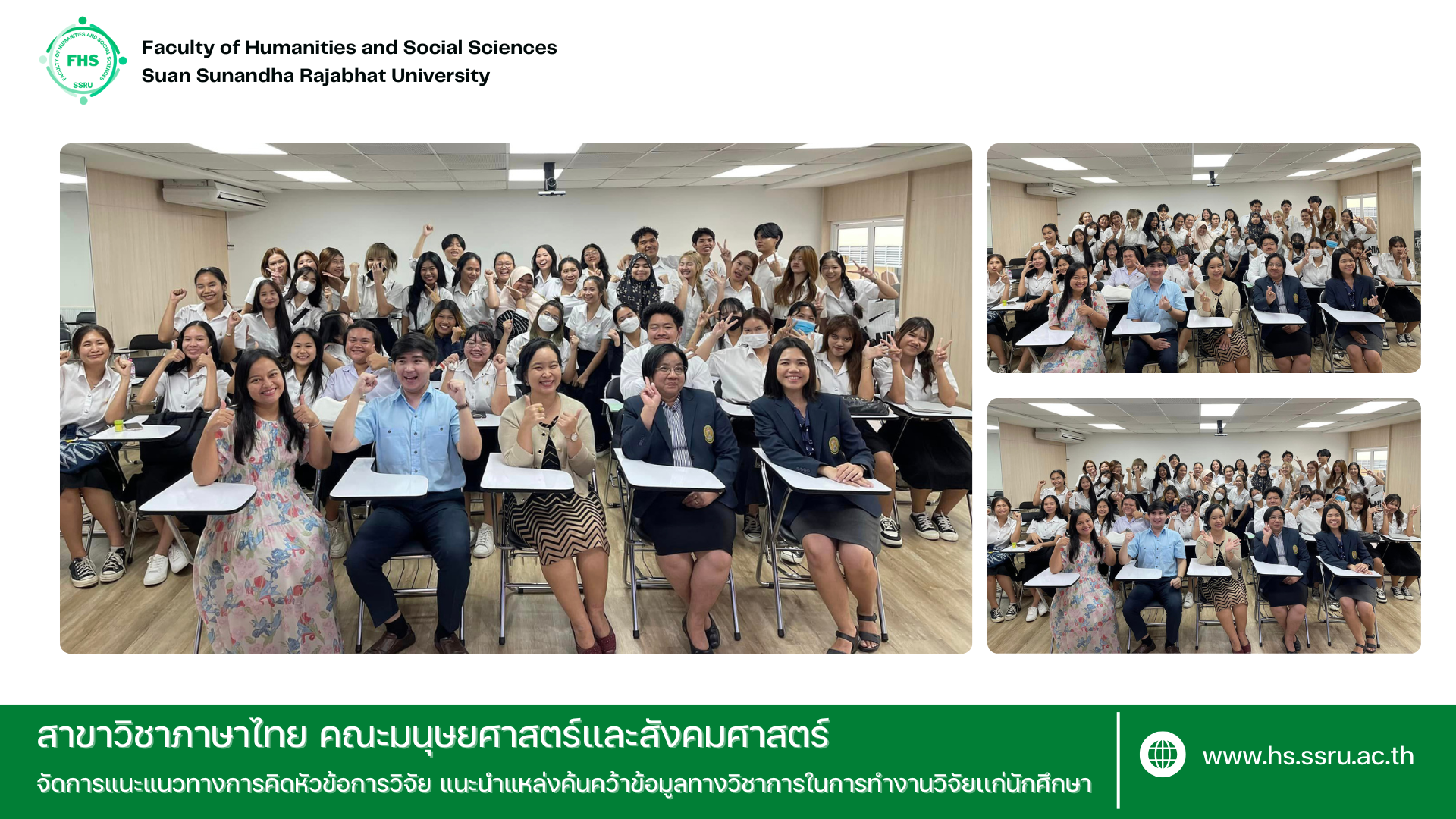 วันที่ 30 ตุลาคม 2567 คณาจารย์สาขาวิชาภาษาไทย ได้แนะแนวทางการคิดหัวข้อการวิจัย แนะนำแหล่งค้นคว้าข้อมูลทางวิชาการ เพื่อเป็นประโยชน์ต่อการทำวิจัยด้านภาษา ภาษาศาสตร์ วรรณคดี วรรณกรรม และคติชนวิทยา ให้แก่นักศึกษาชั้นปีที่ 3 รายวิชาการวิจัยทางภาษาไทย ส่งเสริมให้นักศึกษาได้พัฒนาทักษะทางวิชาการหลายด้าน และมุ่งพัฒนากระบวนการคิด การศึกษาค้นคว้า การนำเสนอทางวิชาการด้านงานวิจัยได้อย่างมีประสิทธิภาพ