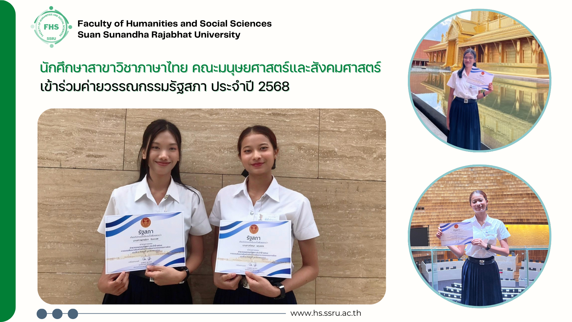 เมื่อวันที่ 14 มีนาคม 2568 นางสาวพุทธธิดา รัมมะนพ และนางสาวกัลญา ผดุงเดช นักศึกษาชั้นปีที่ 2 สาขาวิชาภาษาไทย คณะมนุษยศาสตร์และสังคมศาสตร์ มหาวิทยาลัยราชภัฏสวนสุนันทา ได้รับเกียรติเป็นตัวแทนเข้าร่วม ค่ายวรรณกรรมรัฐสภา ประจำปี 2568 ซึ่งจัดขึ้นภายใต้โครงการประกวดวรรณกรรม รางวัลพานแว่นฟ้า ณ ห้องประชุม B1-2 ชั้น B1 อาคารรัฐสภา เกียกกาย