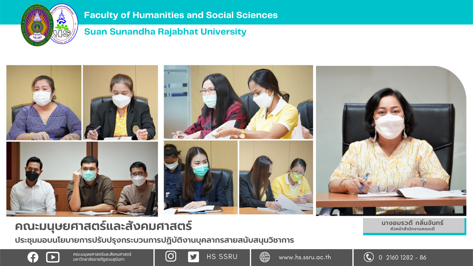 วันที่ 20 ธันวาคม 2564 นางอมรวดี กลิ่นจันทร์ หัวหน้าสำนักงานคณบดีคณะมนุษยศาสตร์และสังคมศาสตร์ เป็นประธานการประชุมบุคลากรสายสนับสนุนวิชาการ เพื่อมอบนโยบายและแนวทางการปรับปรุงกระบวนการปฏิบัติงานของแต่ละฝ่ายงาน เพื่อให้การปฏิบัติงานมีการลดขั้นตอน ลดเวลา แต่คงไว้ซึ่งประสิทธิภาพของการปฏิบัติงานมากที่สุด โดยมีบุคลากรสายสนับสนุนวิชาการเข้าร่วมประชุมโดยพร้อมเพรียง ณ ห้องประชุมพรโสภิณ คณะมนุษยศาสตร์และสังคมศาสตร์