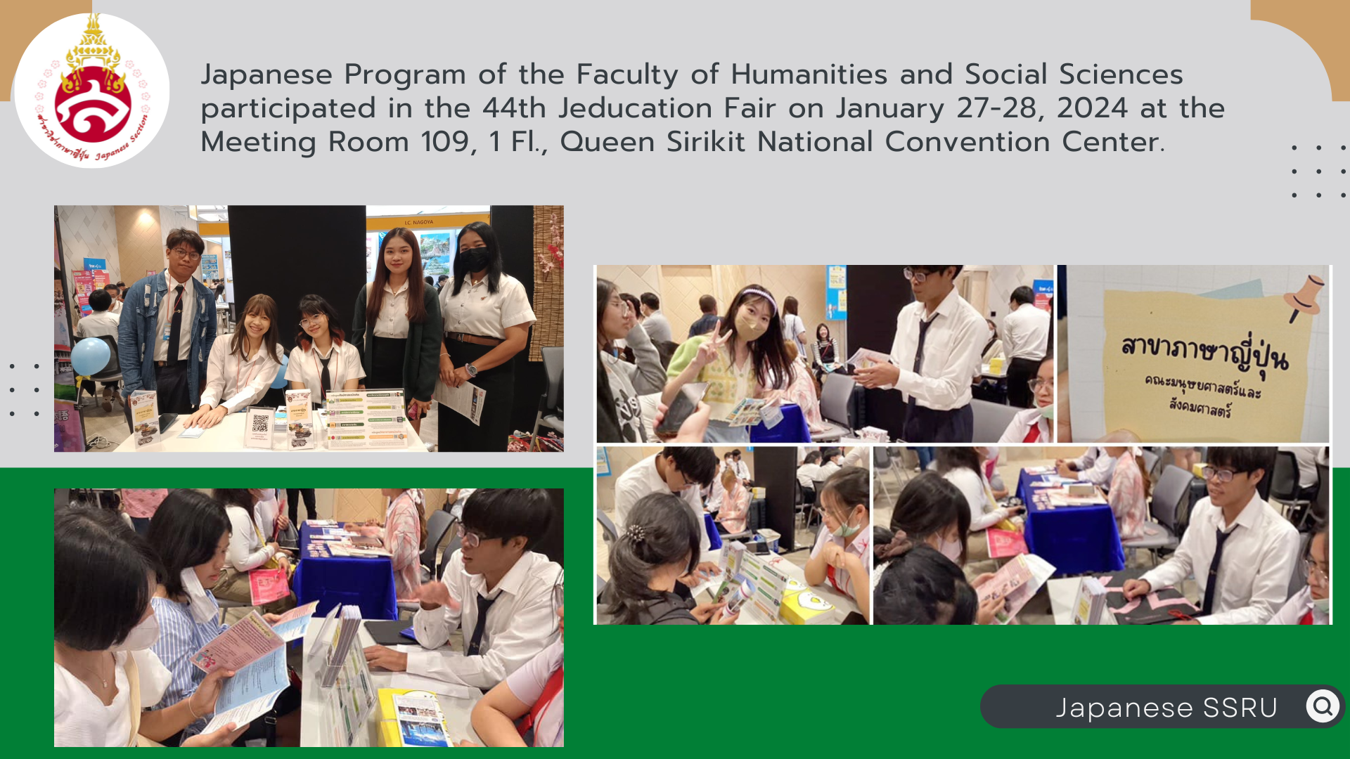 ภาพบรรยากาศงาน Jeducation Fair ครั้งที่ 44 จากบูธสาขาวิชาภาษาญี่ปุ่น คณะมนุษยศาสตร์และสังคมศาสตร์ มหาวิทยาลัยราชภัฏสวนสุนันทา ในงาน Jeducation Fair ครั้งที่ 44 ระหว่างวันที่ 27 - 28 มกราคม 2024 ณ ห้อง MEETING 109 ชั้น 1 ศูนย์การประชุมแห่งชาติสิริกิติ์