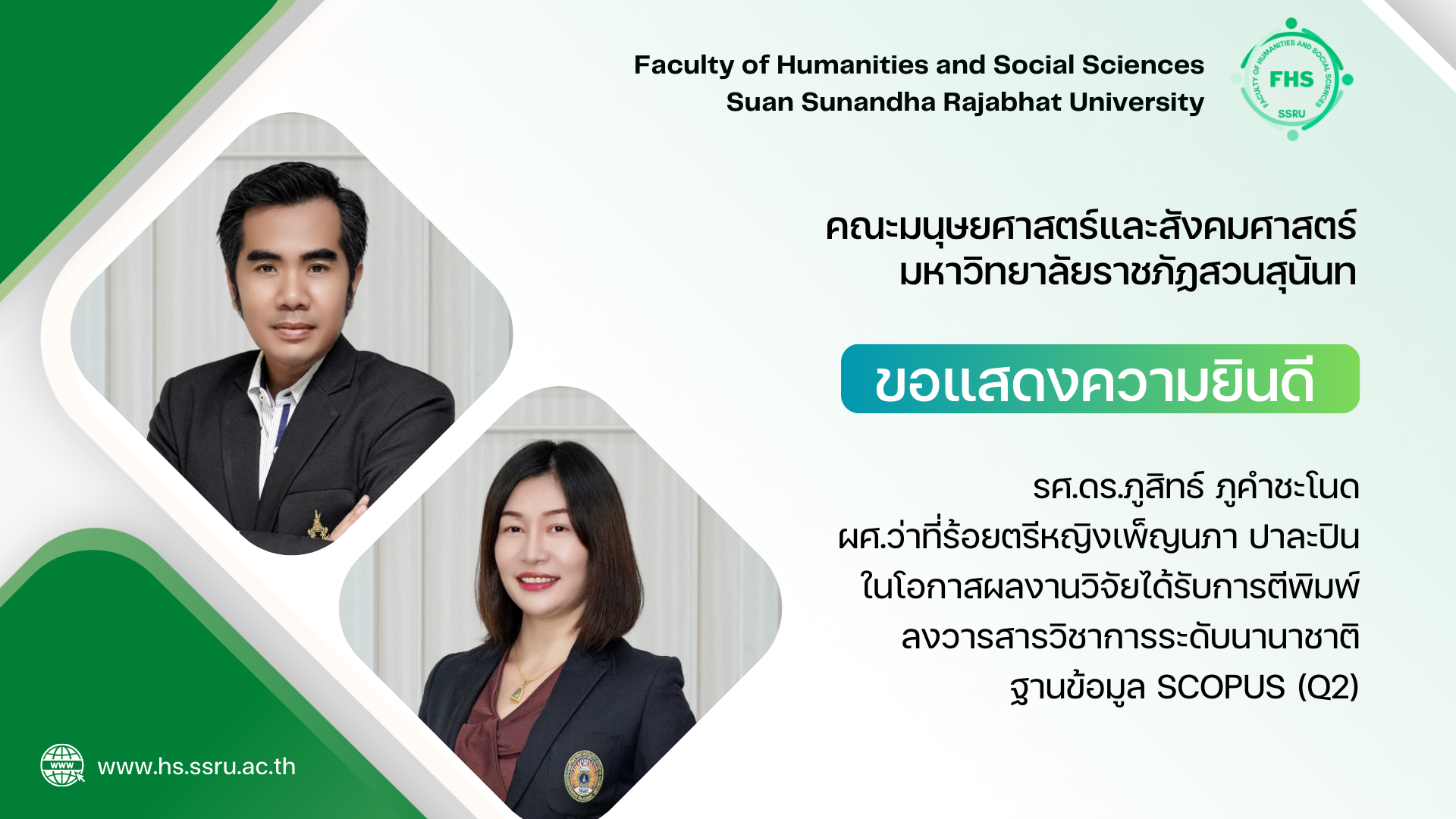 ขอแสดงความยินดีกับ รองศาสตราจารย์ ดร.ภูสิทธ์ ภูคำชะโนด เเละ ผู้ช่วยศาสตราจารย์ ว่าที่ร้อยตรีหญิงเพ็ญนภา ปาละปิน ในโอกาสผลงานวิจัยเรื่อง The Role of Urban Community Leaders in Local Product Development Using Intellectual Capital. A Case Study of Bangkok, Thailand ได้รับการตีพิมพ์ลงวารสารวิชาการระดับนานาชาติ Journal of Ecohumanism ในฐานข้อมูล SCOPUS (Q2)