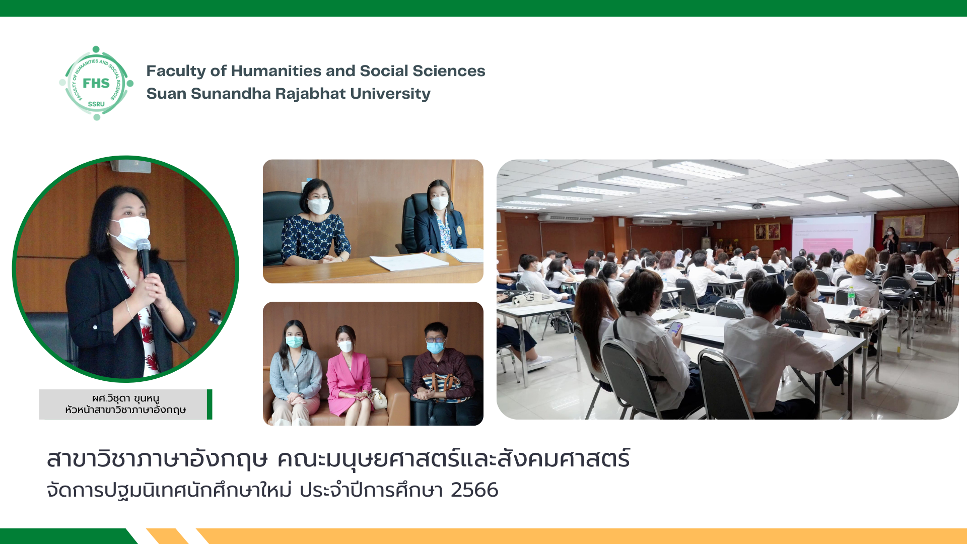 วันที่ 4 กรกฎาคม พ.ศ. 2566 สาขาวิชาภาษาอังกฤษ คณะมนุษยศาสตร์และสังคมศาสตร์ จัดการปฐมนิเทศนักศึกษาใหม่ โดยมี ผศ.วิชุดา ขุนหนู หัวหน้าสาขาวิชาภาษาอังกฤษพร้อมคณาจารย์ในสาขา เข้าร่วมต้อนรับนักศึกษาใหม่ ประจำปีการศึกษา 2566 ณ ห้องประชุมนิภานภดล ชั้น 2 อาคาร 35 คณะมนุษยศาสตร์และสังคมศาสตร์