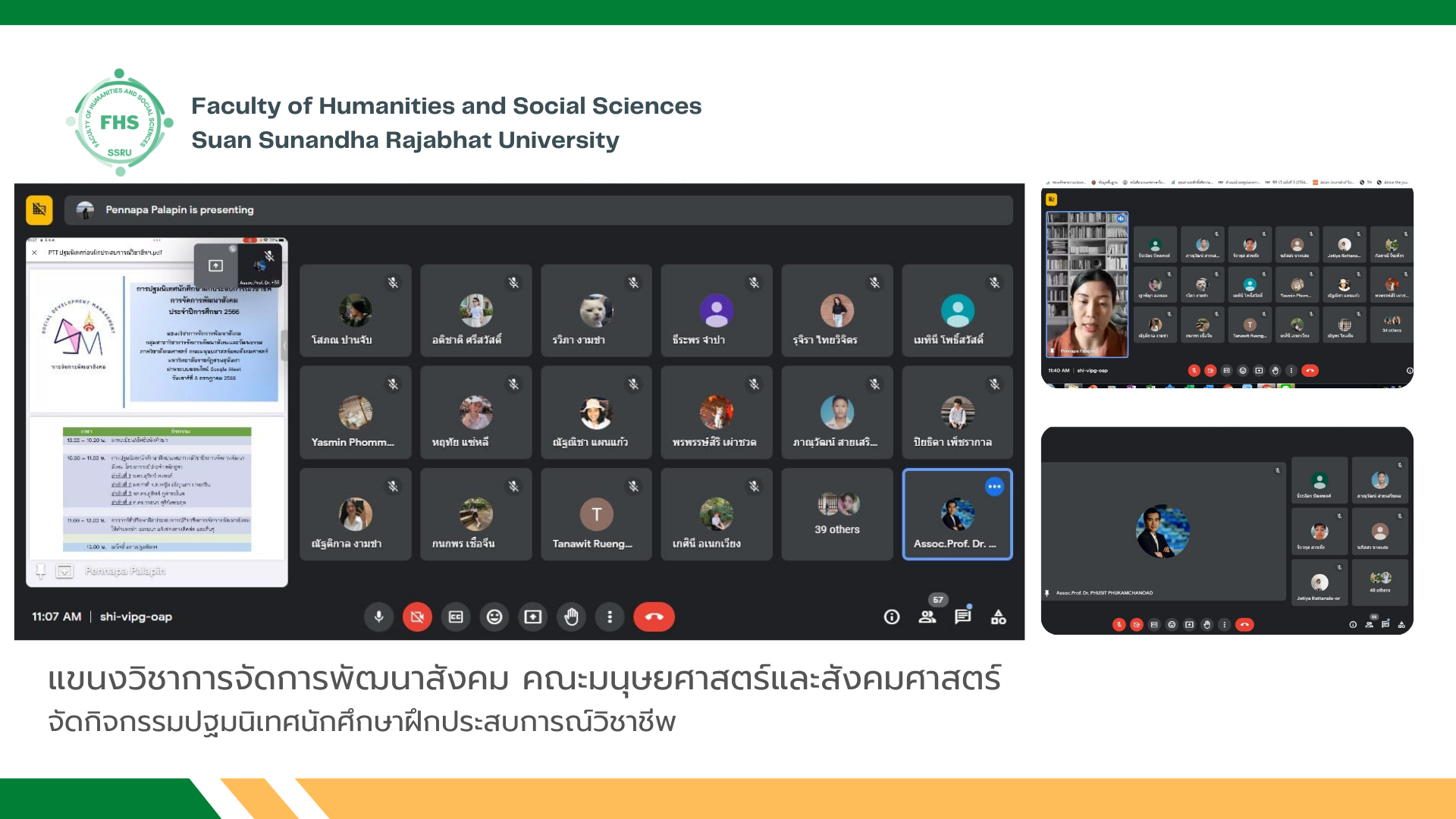 วันที่ 8 กรกฎาคม พ.ศ.2566 แขนงวิชาการจัดการพัฒนาสังคม กลุ่มสาขาวิชาการจัดการพัฒนาสังคมและวัฒนธรรม คณะมนุษยศาสตร์และสังคมศาสตร์ ได้จัดกิจกรรมปฐมนิเทศนักศึกษาฝึกประสบการณ์วิชาชีพการจัดการพัฒนาสังคม ประจำปี 2566 โดยจัดผ่านระบบออนไลน์(Google Meet) เพื่อเตรียมความพร้อมใหแก่นักศึกษา ชั้นปีที่ 4 ที่กำลังจะออกฝึกประสบการณ์วิชาชีพ