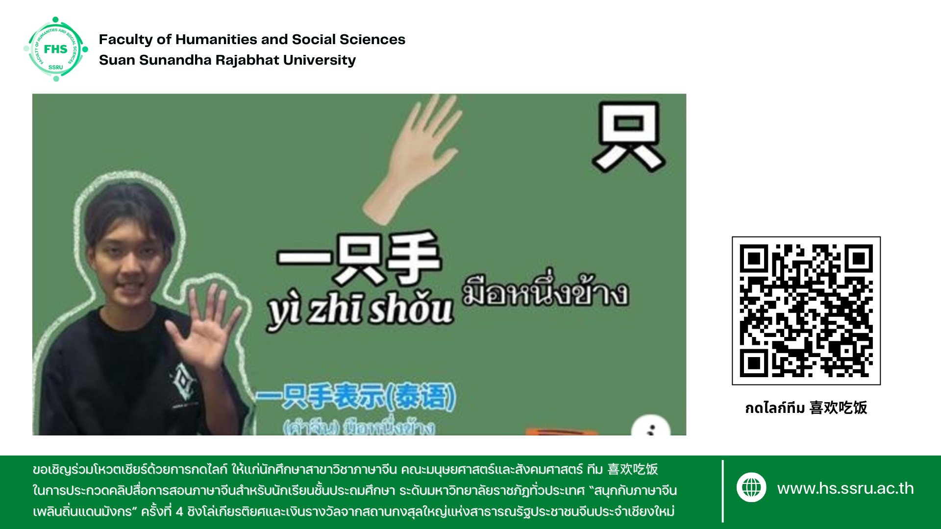ขอเชิญร่วมโหวตเชียร์ด้วยการกดไลก์ ให้แก่นักศึกษาสาขาวิชาภาษาจีน คณะมนุษยศาสตร์และสังคมศาสตร์ ทีม喜欢吃饭 กับทีม 飞龙 ที่ผ่านเข้ารอบชิงชนะเลิศ 10 ทีม ในการประกวดคลิปสื่อการสอนภาษาจีนสำหรับนักเรียนชั้นประถมศึกษา ระดับมหาวิทยาลัยราชภัฏทั่วประเทศ “สนุกกับภาษาจีน เพลินถิ่นแดนมังกร” ครั้งที่ 4 ชิงโล่เกียรติยศและเงินรางวัลจากสถานกงสุลใหญ่แห่งสาธารณรัฐประชาชนจีนประจำเชียงใหม่ เปิดโหวตตั้งแต่วันนี้จนถึง 3 พฤศจิกายน 2567
