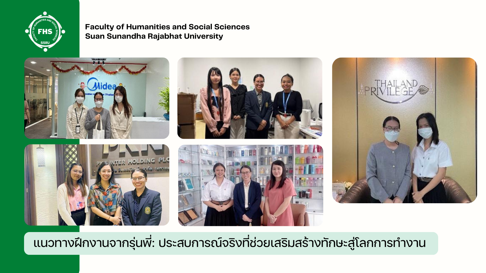 นักศึกษาที่กำลังเตรียมตัวฝึกงานสามารถนำแนวทางจากรุ่นพี่มาเป็นแรงบันดาลใจได้ โดยในปีนี้ นักศึกษาสาขาวิชาภาษาจีน คณะมนุษยศาสตร์และสังคมศาสตร์ มหาวิทยาลัยราชภัฏสวนสุนันทา หลายท่านได้เข้าฝึกงานกับองค์กรชั้นนำ นำความรู้ทางวิชาการไปปรับใช้กับการทำงานจริง พร้อมเรียนรู้สภาพแวดล้อมและวัฒนธรรมองค์กรที่แตกต่างกันออกไป