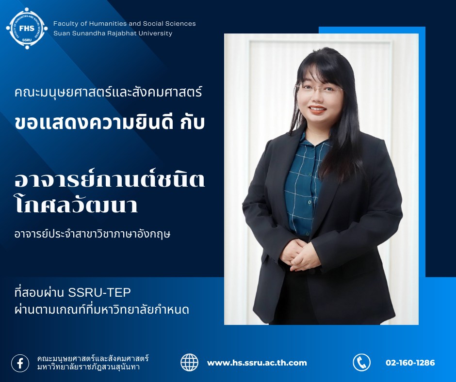 คณะมนุษยศาสตร์และสังคมศาสตร์ ขอแสดงความยินดี กับอาจารย์กานต์ชนิต โกศลวัฒนา อาจารย์ประจำสาขาวิชาภาษาอังกฤษ ที่สอบผ่าน SSRU-TEPผ่านตามเกณท์ที่มหาวิทยาลัยกำหนด