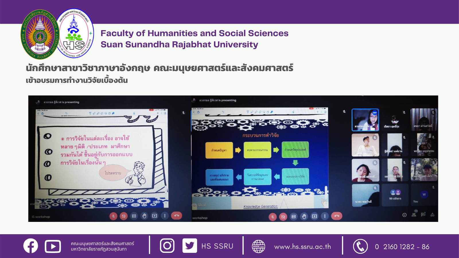 วันที่ 29 มิถุนายน 2564 นักศึกษาชั้นปีที่ 4 สาขาวิชาภาษาอังกฤษ คณะมนุษยศาสตร์และสังคมศาสตร์ เข้าร่วมอบรมการทำวิจัยเบื้องต้น ผ่านทาง Google Meet โดยมี ผศ.ดร.ดวงกมล ฐิติเวส ให้เกียรติเป็นวิทยากรในการอบรมครั้งนี้