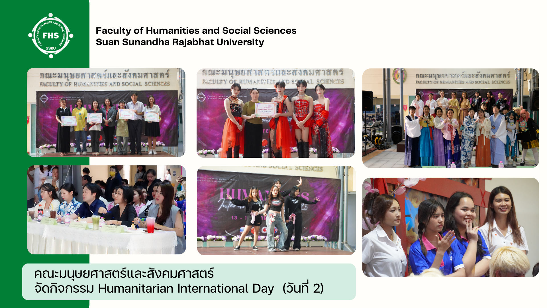 วันที่ 14 กุมภาพันธ์ 2568 คณะมนุษยศาสตร์และสังคมศาสตร์ มหาวิทยาลัยราชภัฏสวนสุนันทา โดยภาควิชามนุษยศาสตร์ จัดกิจกรรม Humanitarian International Day (วันที่ 2) ซึ่งกิจกรรมในวันนี้ มีการจัดนิทรรศการวัฒนธรรมนานาชาติ, การออกร้านจากนักศึกษา, กิจกรรม “Squid Game” จากสถาบันภาษาเกาหลีเซจง กรุงเทพ 2, การแสดง Fashion Show ชุดนานาชาติ, การแสดงจากนักศึกษาสาขาวิชาภาษาญี่ปุ่นและสาขาวิชาภาษาอังกฤษ และการประกวด Cover Dance Contest โดยมี ผู้บริหาร คณาจารย์ บุคลากร และนักศึกษา ทั้งจากคณะมนุษยศาสตร์และสังคมศาสตร์ และต่างคณะ เข้าร่วมกิจกรรมในครั้งนี้ ณ ลานกิจกรรมชั้น 1 อาคาร 35 คณะมนุษยศาสตร์และสังคมศาสตร์ มหาวิทยาลัยราชภัฏสวนสุนันทา